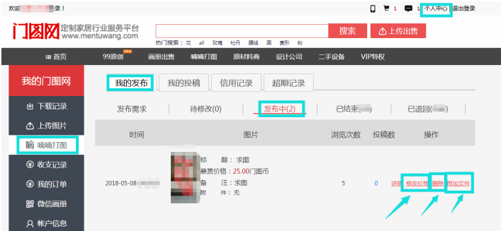 ① 可在嘀嘀打图 > 我的发布 增加赏金(地址:http://www.mentuwang.com/userDemand/list/1);
